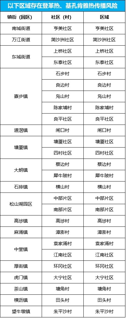 当今已插足登革热、基孔肯雅热高发季节。甩手8月9日24时,东莞以下区域存在登革热、基孔肯雅热传播风险,请市民属目作念好戒备作为: